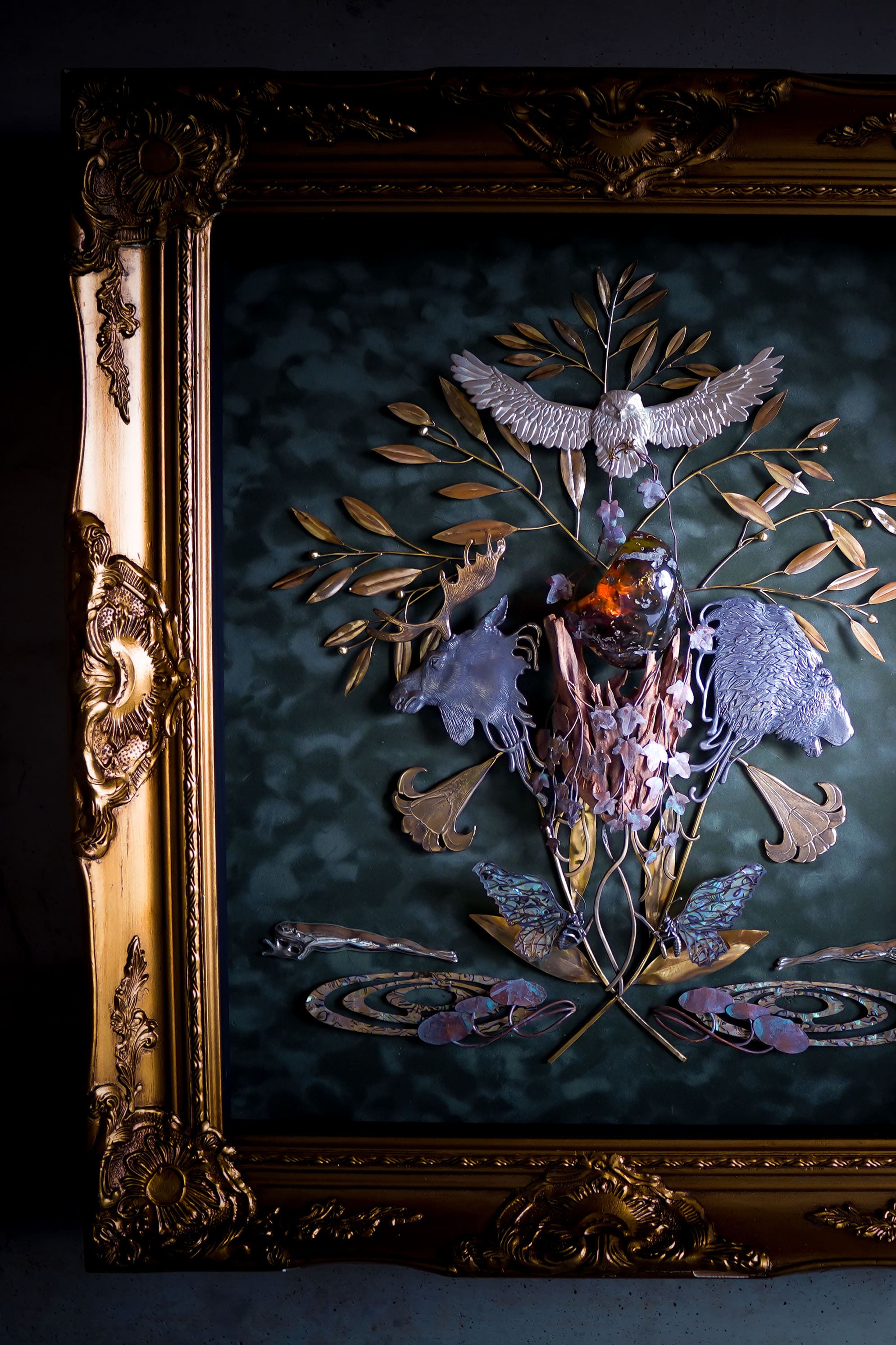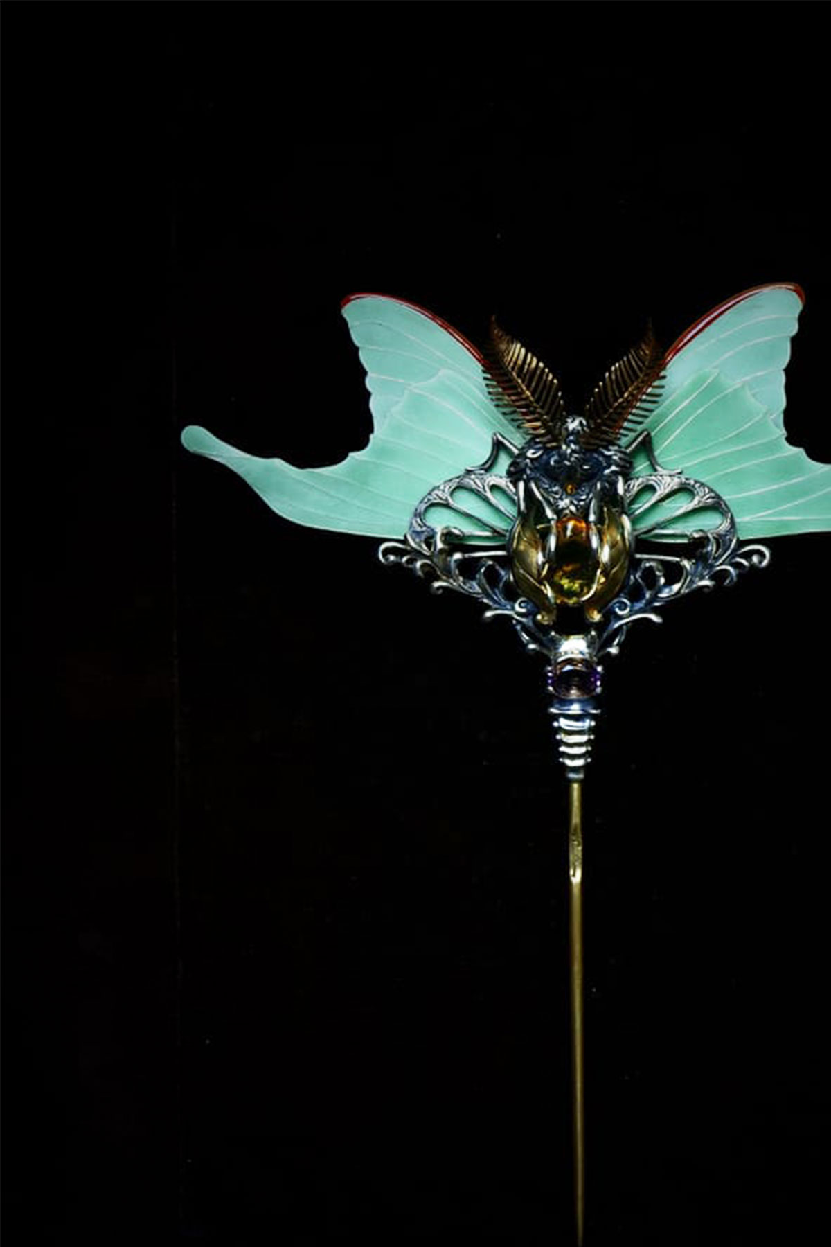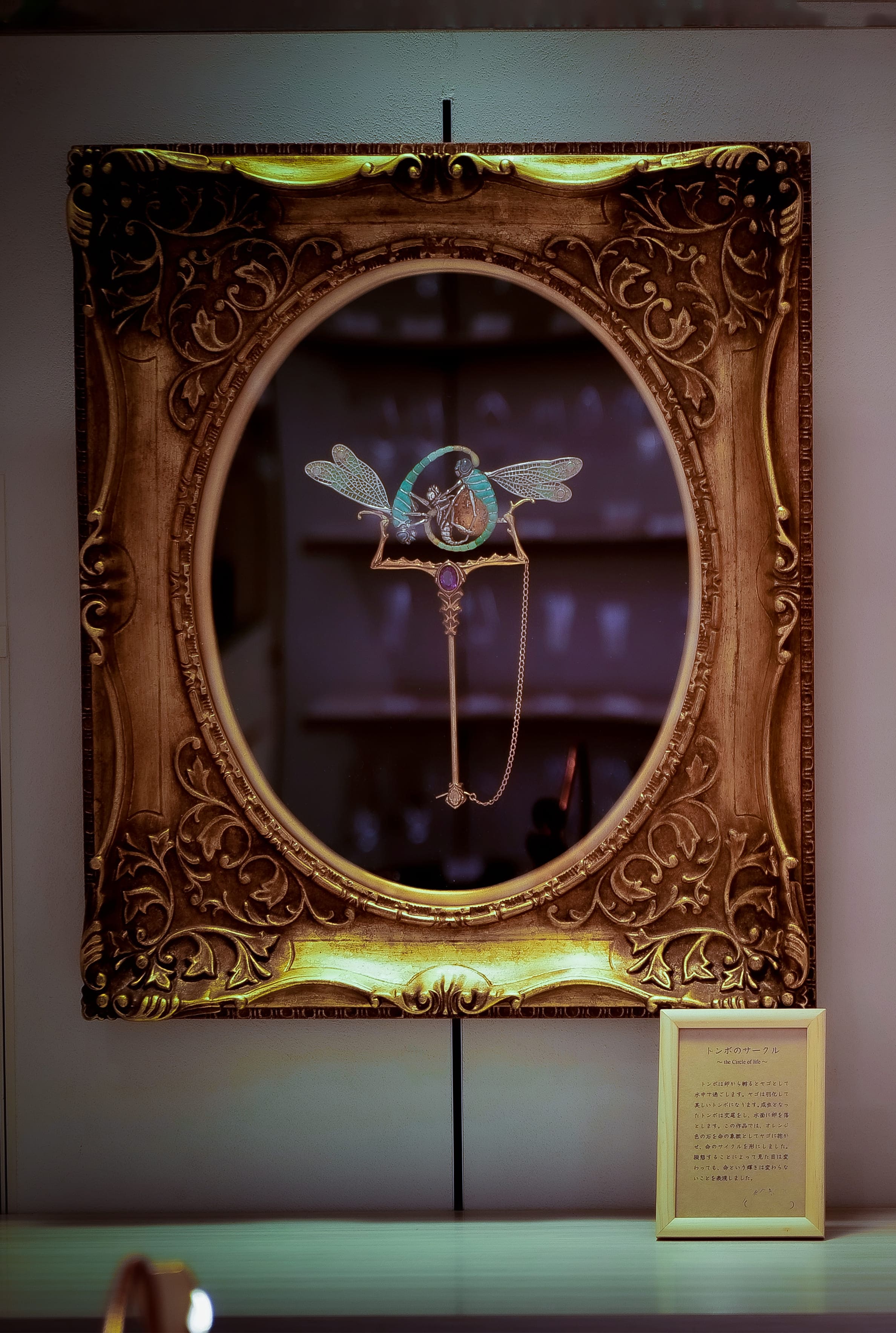 この作品では、オレンジ色の石(琥珀)を命の象徴としてヤゴに抱かせ、命のサイクルを形にしました。擬態することによって見た目は変わっても、命という輝きは変わらないことを表現しました。