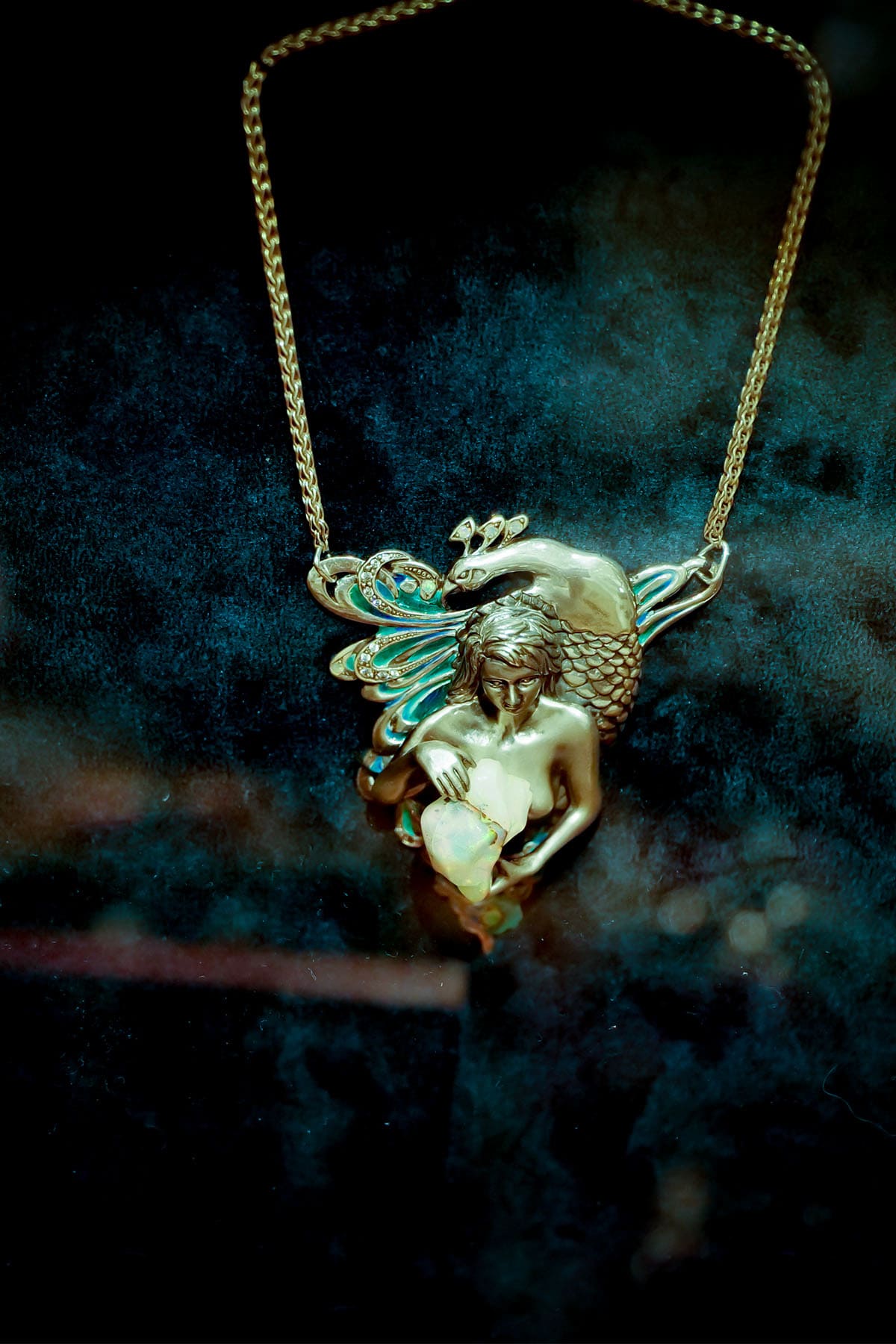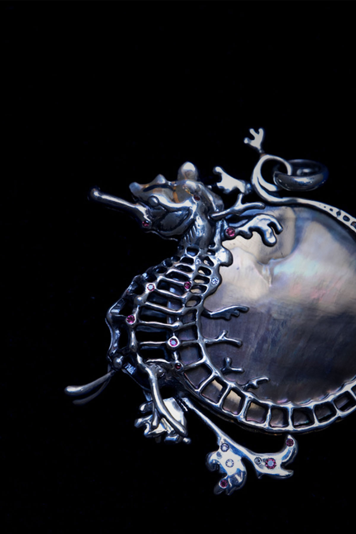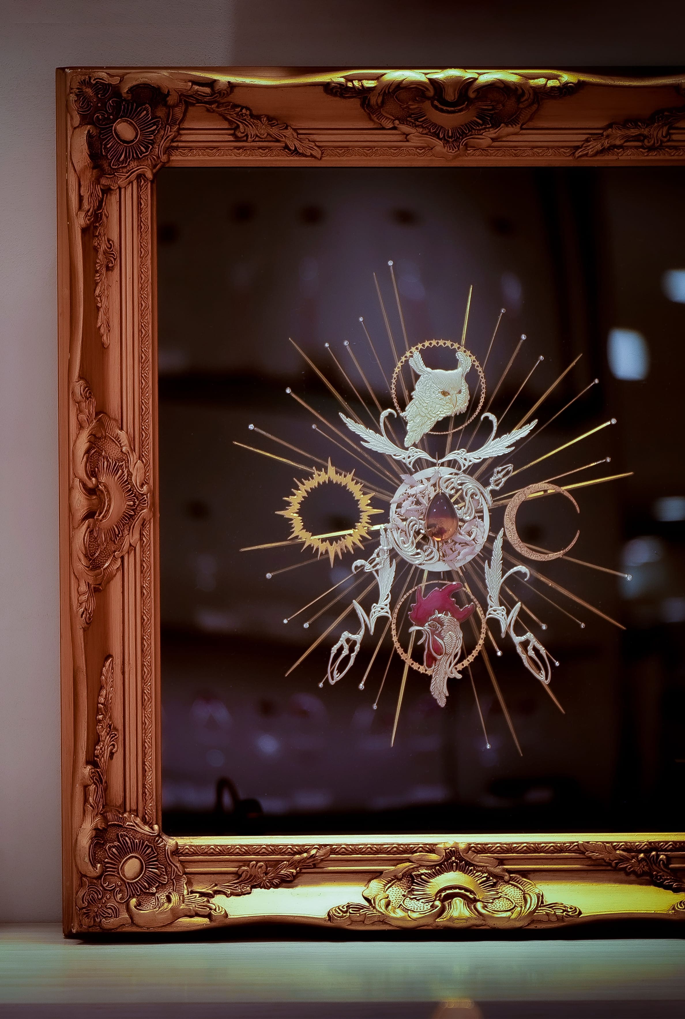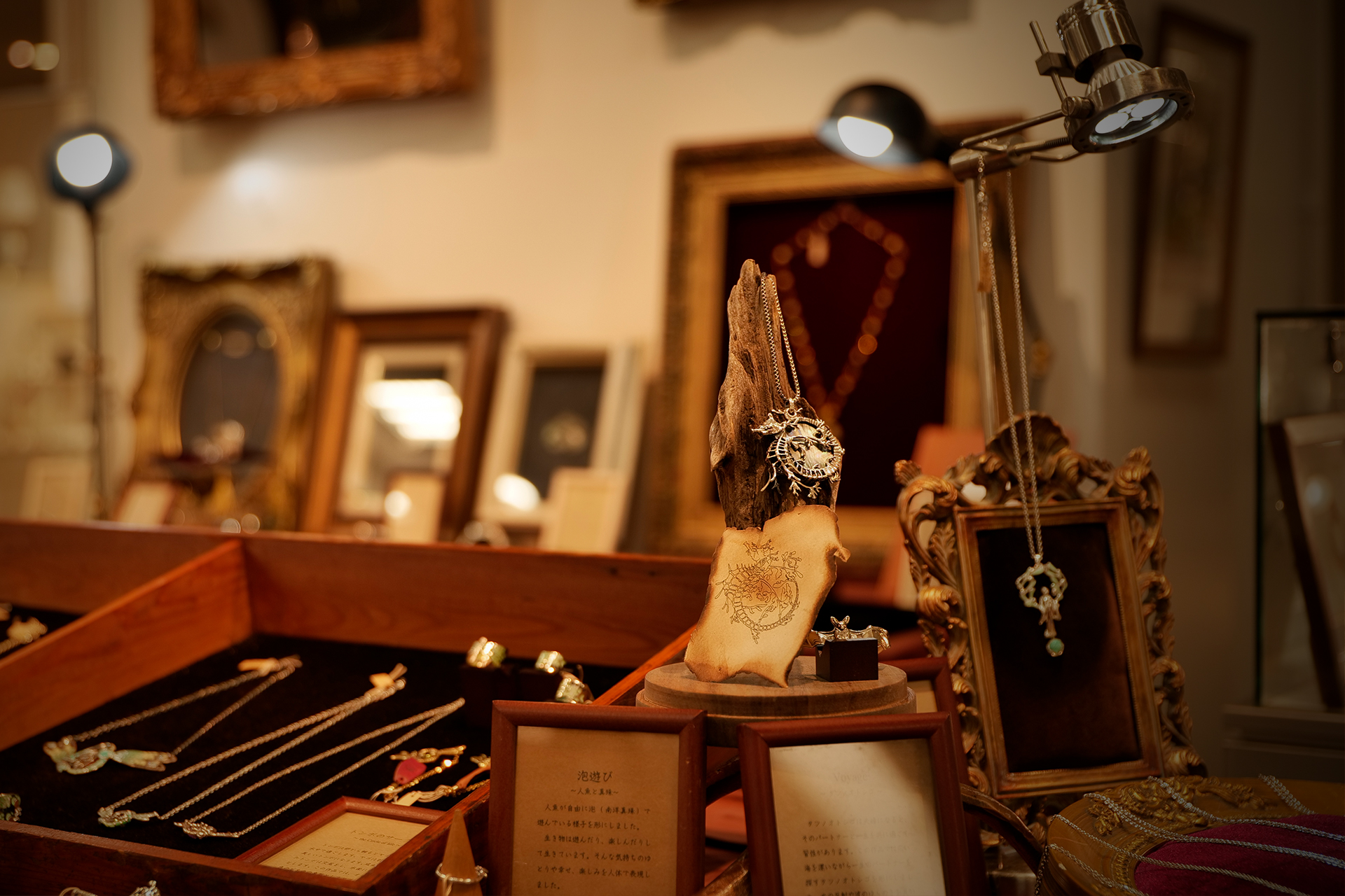 この作品では、オレンジ色の石(琥珀)を命の象徴としてヤゴに抱かせ、命のサイクルを形にしました。擬態することによって見た目は変わっても、命という輝きは変わらないことを表現しました。