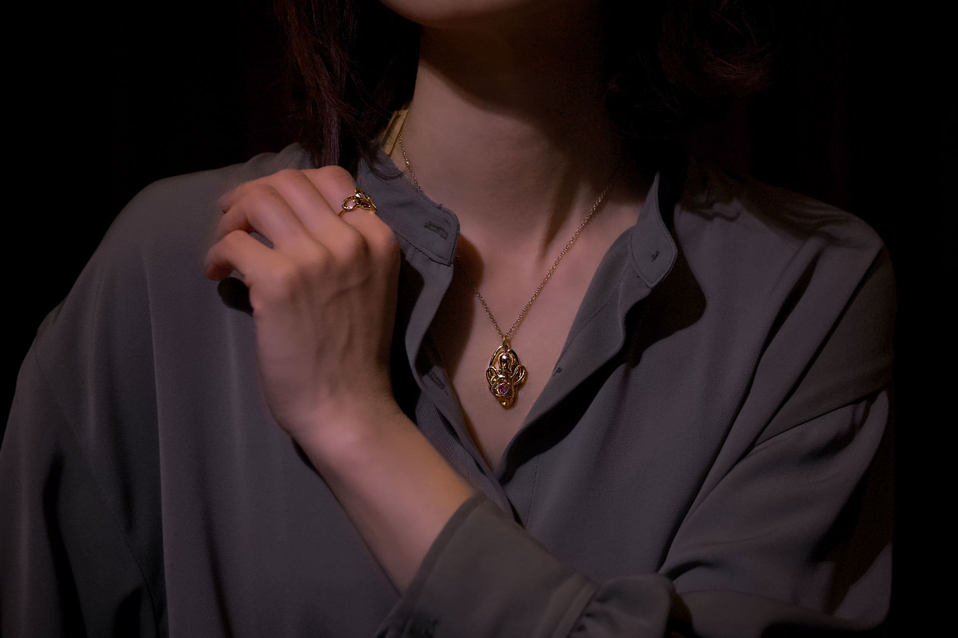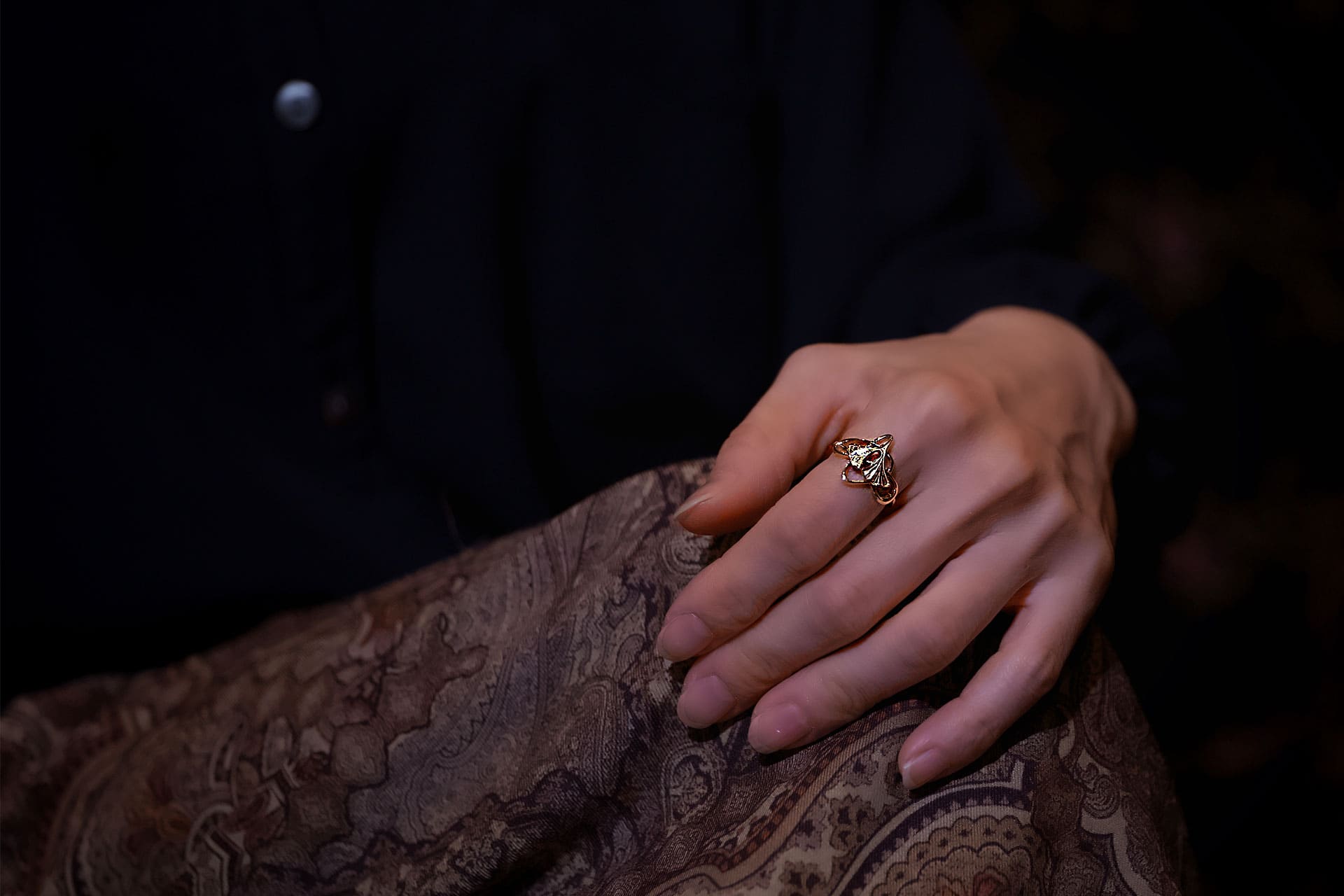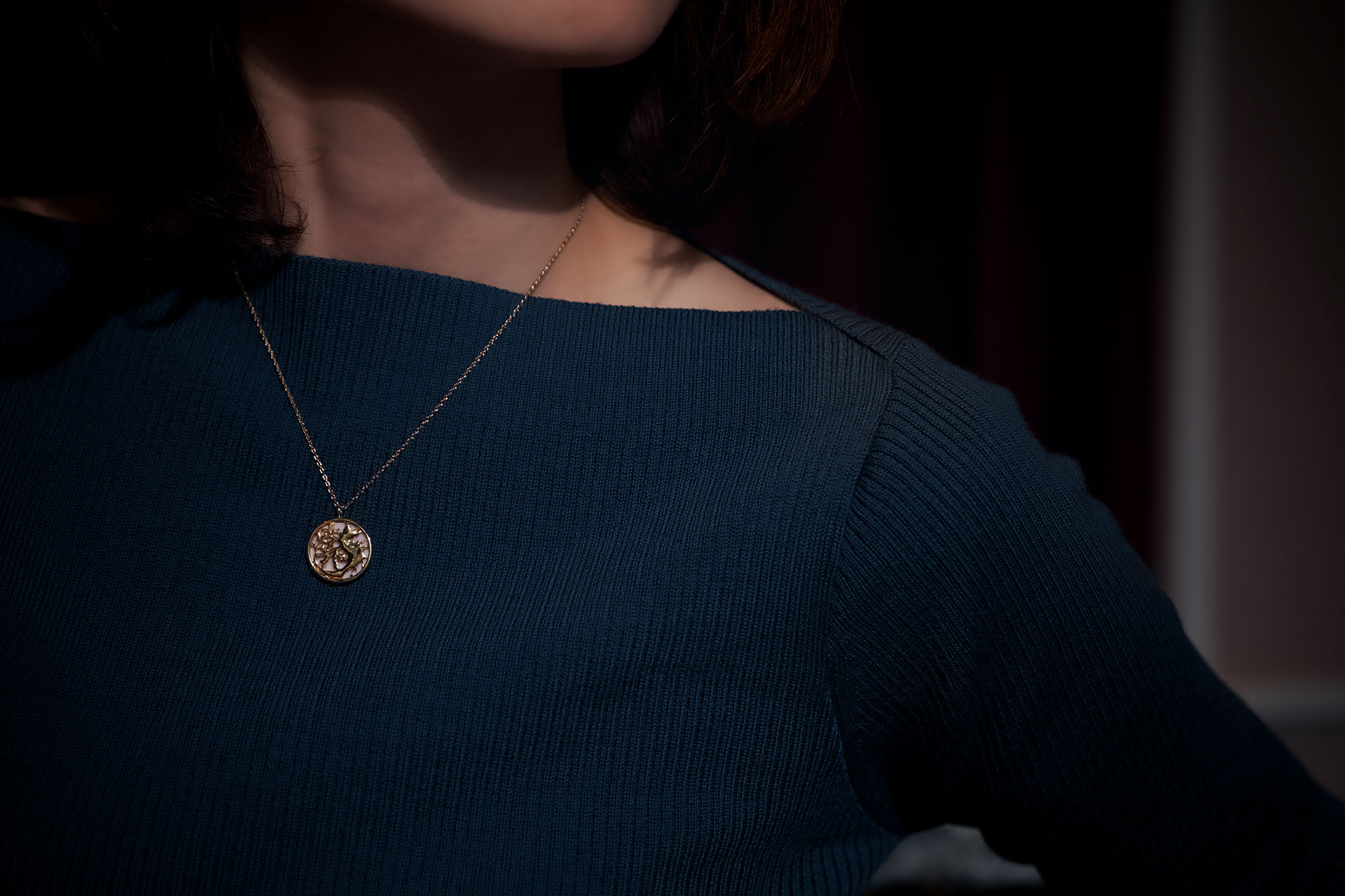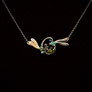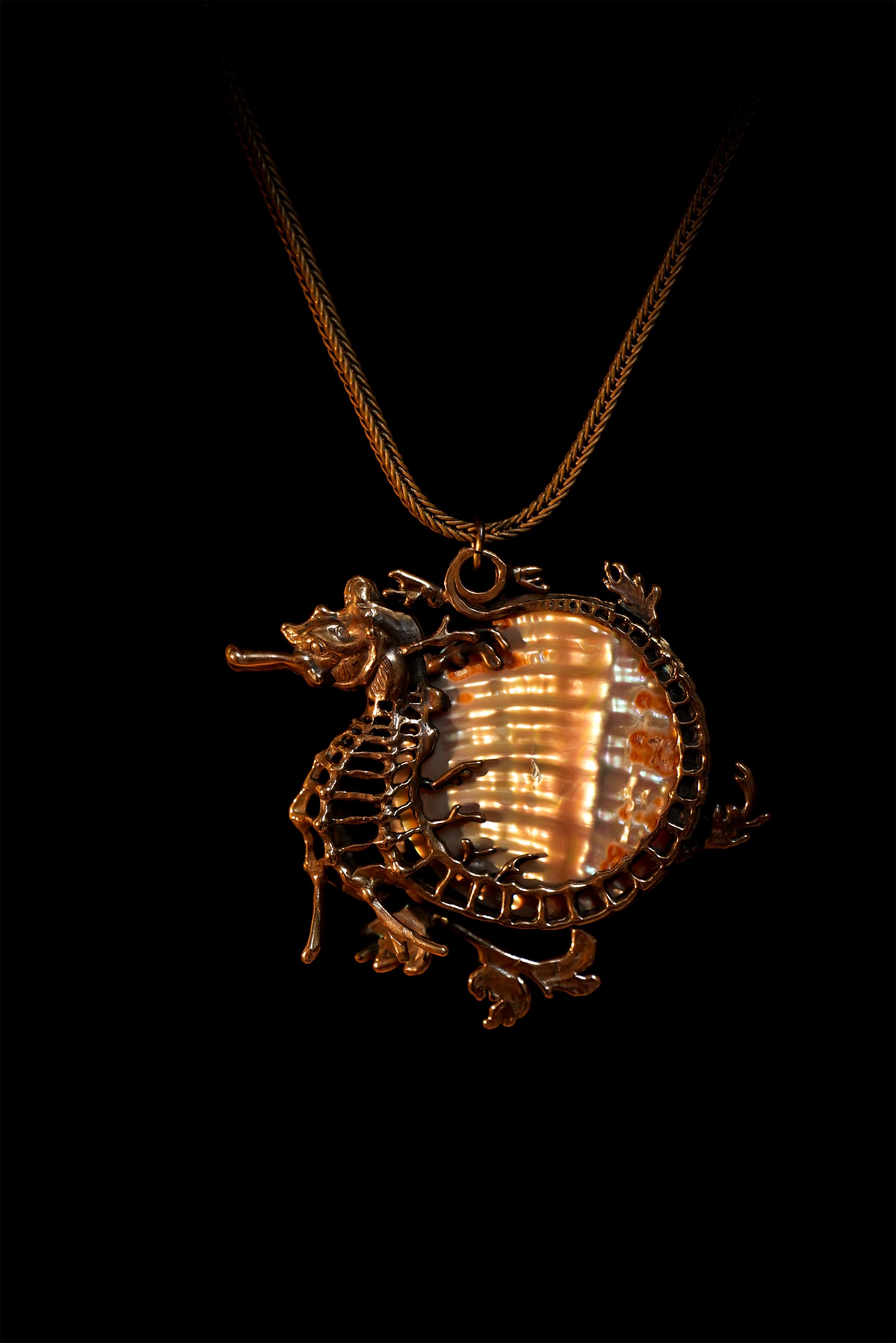 この作品では広い海を漂いながら一生のパートナーを探すタツノオトシゴを形にしました。光の反射や波のゆらめきを貝から連想し、タツノオトシゴのヒレで浮遊する水中の情景を表現しました。安心して波に身を委ねながら、きっと見つかる大事な探しものをしている旅人とは、素敵な生き方なのかもしれません。