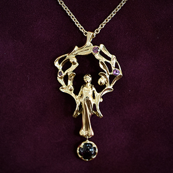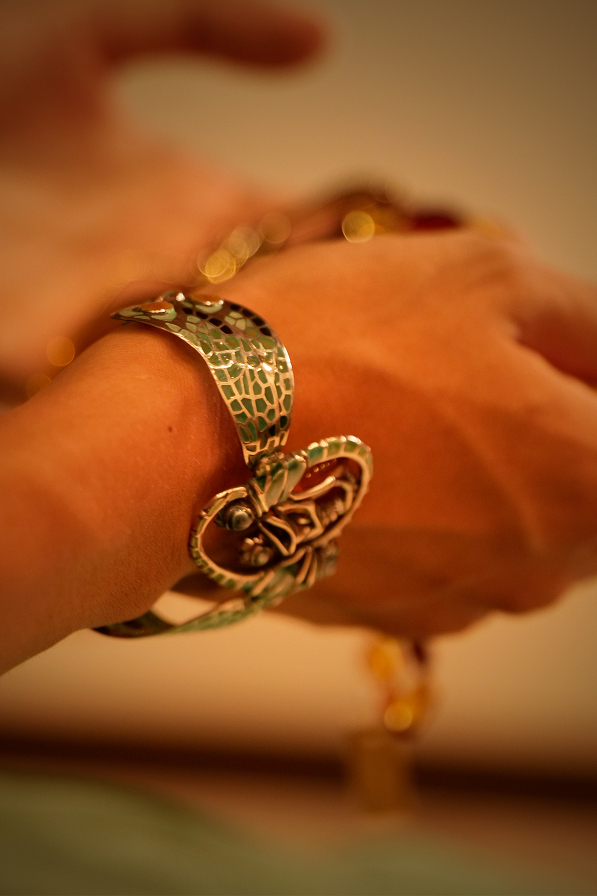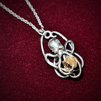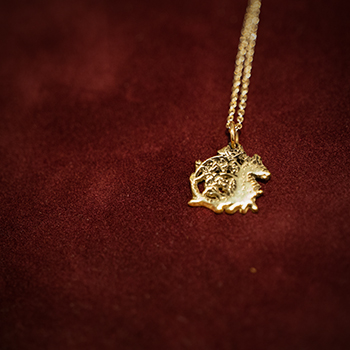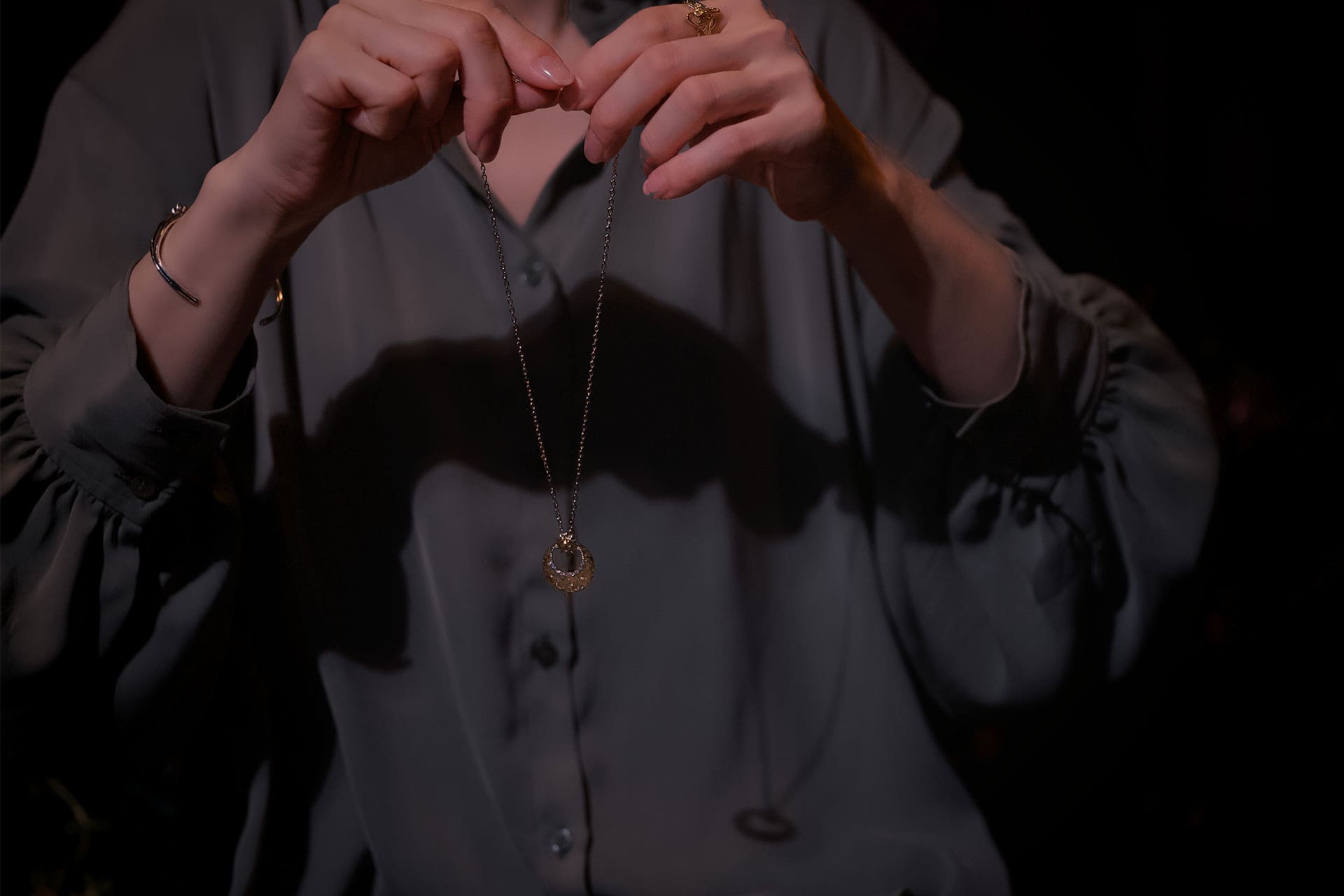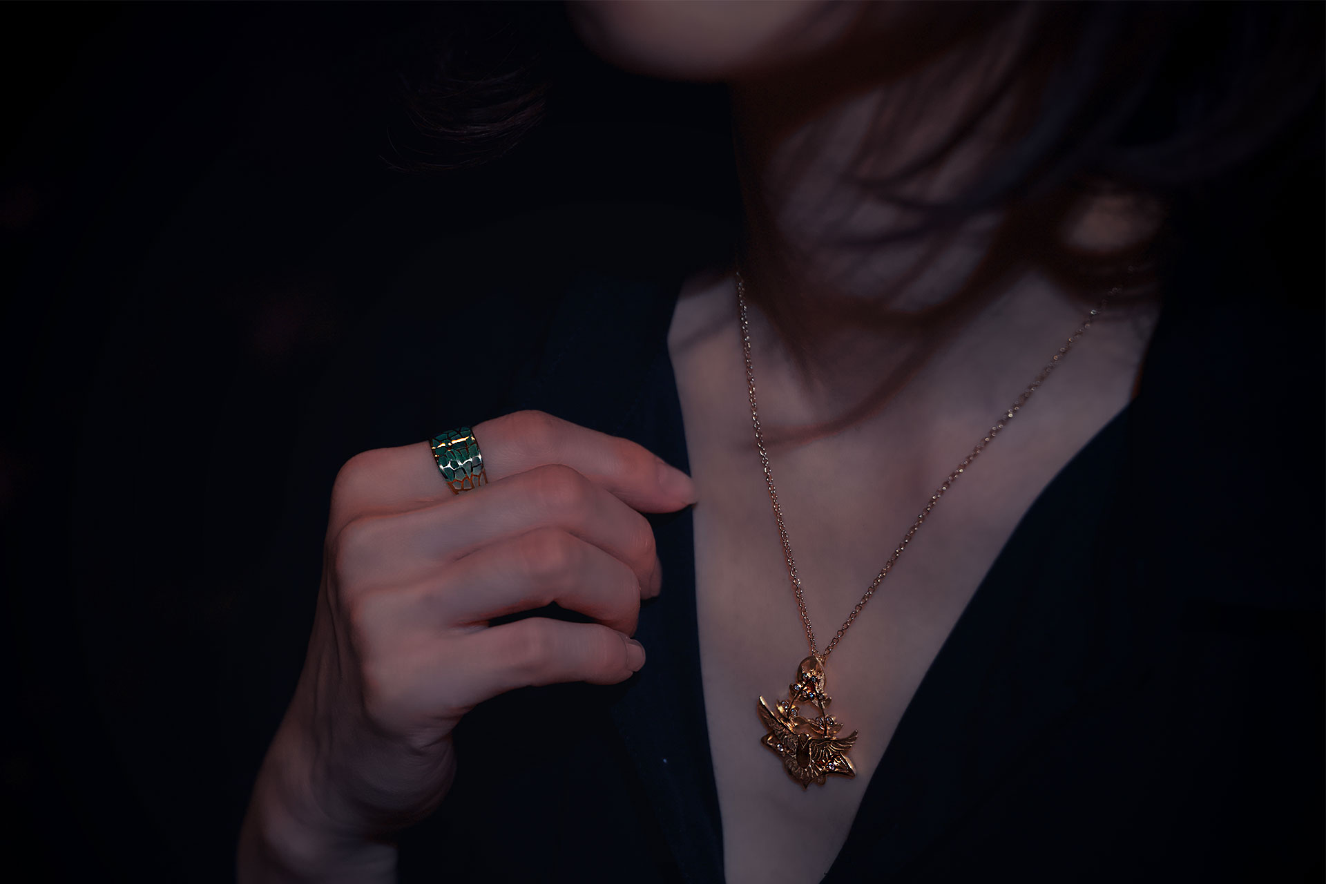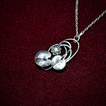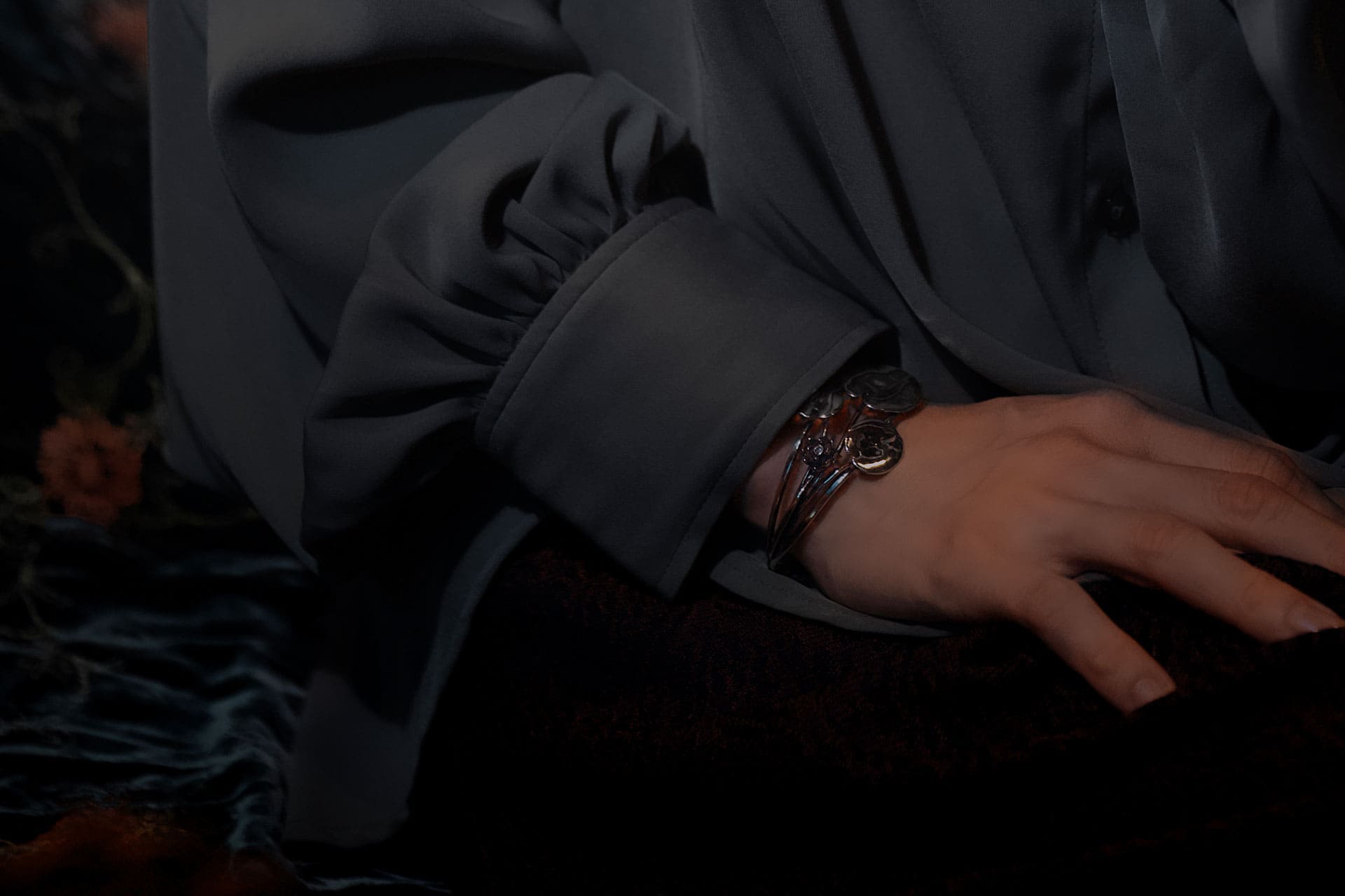 この作品では広い海を漂いながら一生のパートナーを探すタツノオトシゴを形にしました。光の反射や波のゆらめきを貝から連想し、タツノオトシゴのヒレで浮遊する水中の情景を表現しました。安心して波に身を委ねながら、きっと見つかる大事な探しものをしている旅人とは、素敵な生き方なのかもしれません。
