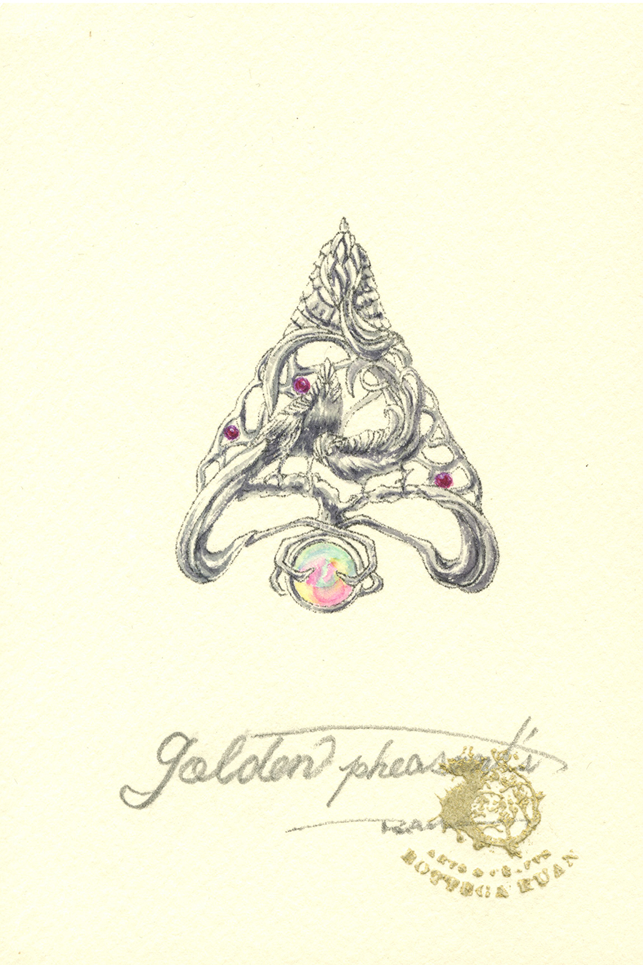 この作品では、オレンジ色の石(琥珀)を命の象徴としてヤゴに抱かせ、命のサイクルを形にしました。擬態することによって見た目は変わっても、命という輝きは変わらないことを表現しました。